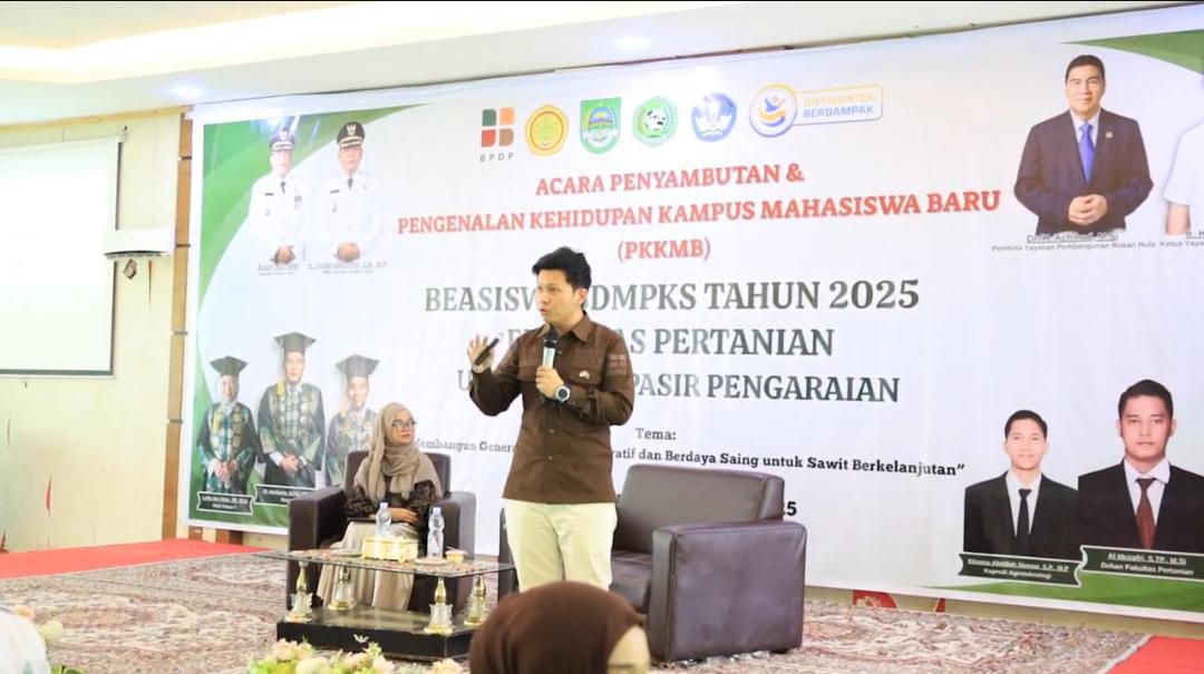 Rohul, Okegas.co.id – Universitas Pasir Pengaraian (UPP), Kabupaten Rokan Hulu (Rohul) laksanakan kegiatan menyambut kedatangan mahasiswa baru yang menerima beasiswa dari Direktorat Jenderal Perkebunan Kementerian Pertanian dan Badan Pengelola Dana Perkebunan Kelapa Sawit Sumber Daya Manusia Perkebunan Kelapa Sawit (SDMPKS) tahun 2025, berlangsung di Aula UPP pada Selasa (23/09/2025).